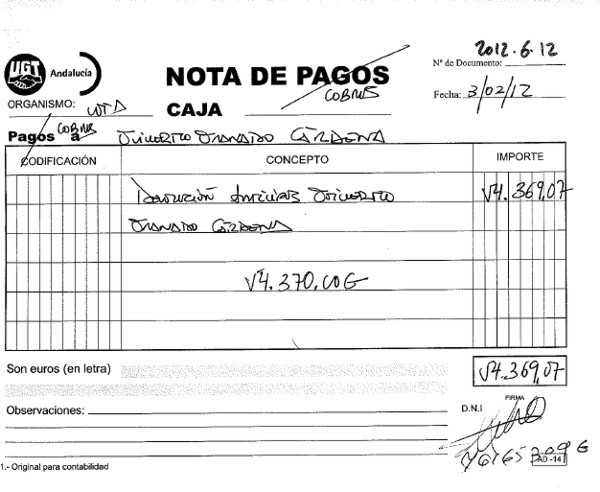 En el segundo de los casos, el del ingreso de 54.370 euros, aunque se utiliza el mismo concepto, la firma y el DNI corresponden a Pepe "El Carpintero" alias de José Labrador Vargas, un militante de UGT. Véanlo: