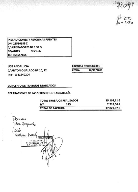 La ingeniería contable: el extraño caso de la devolución en metálico a UGT de la base imponible de dos facturas pagadas por la UGT. Ambos ingresos en caja corresponden a la base imponible de sendas facturas. El primero, el de menor cuantía, 15.1013,11 euros corresponde a la factura 018/2011 de Instalaciones y Reformas Fuentes, cuyo titular es, en efecto, Francisco Fuentes Cachinero. El importe entregado en metálico se corresponde justamente con la base imponible de dicha factura como puede verse a continuación.