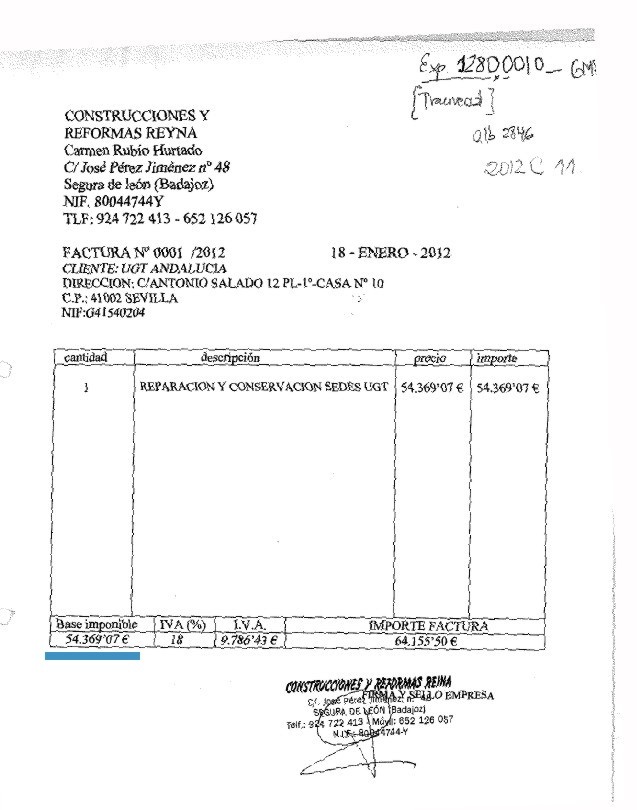 El segundo ingreso, el mayor, por importe de 54.369,07 euros, corresponde a la factura número 1/2012 de Construcciones y Reformas Reyna, una empresa de Segura de León, Badajoz, en la que figura como responsable Carmen Rubio Hurtado.