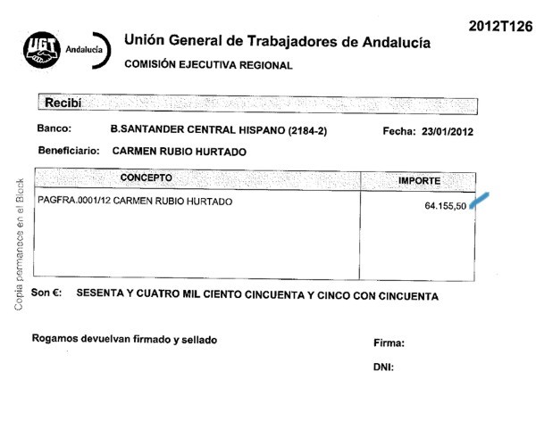 En ambos casos, UGT pagó las facturas por su importe completo y, sin embargo, recibió con posterioridad el importe de la base imponible de ambas en dinero en metálico y por caja, dinero que fue finalmente introducido en bolsas de basura negras. Que UGT las pagó se demuestra con este documento que se corrobora con el cheque nominativo del Banco de Santander a nombre de Carmen Rubio Hurtado, cuya copia obra en poder de Libertad Digital.