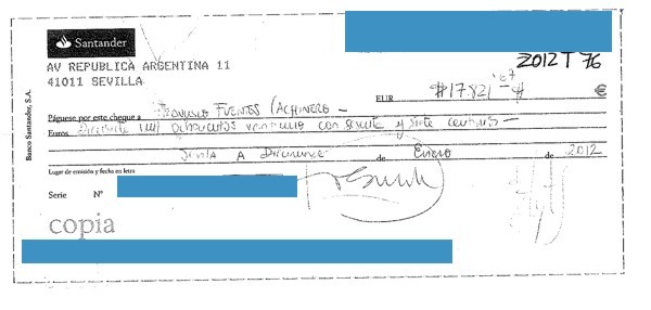 En el caso de la factura 018/2011 de Instalaciones y Reformas Fuentes, se siguió el mismo sistema, mediante un recibí y un cheque:
