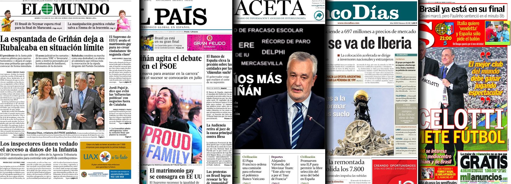 Portadas de los diarios El Mundo, El País, ABC, La Razón, La Vanguardia, La Gaceta, El Periódico, Cinco Días, El Economista, Expansión, Marca, As, Mundo Deportivo y Sport.