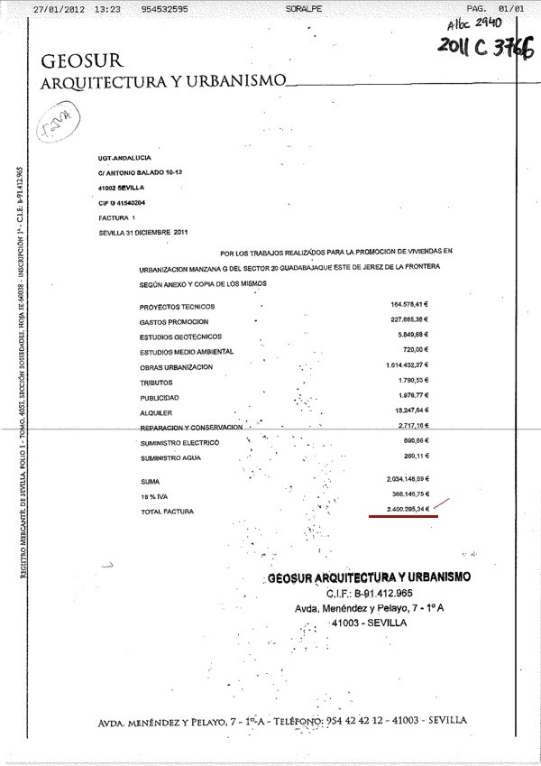 De ser cierta, la inversión de UGT es ruinosa, pero además es sospechosa porque una diligencia de la Agencia Tributaria detectó irregularidades en el pago de 18.000 euros realizado por la central sindical a la entidad Gecovisa. Esta circunstancia se agravó al comprobarse que el pago se realizó por UGT a la cuenta que, según consta en las bases de datos de la Agencia Tributaria. pertenecía a SORALPE I+P Asociados S.L. En marzo de 2013, la Agencia analizó la facturación de la sociedad Geosur, supuestamente encargada de la dirección de la obra y que entre septiembre de 2008 y 2012 recibió del sindicato casio 2,7 millones de euros por difeerentes conceptos, entre ellos el de obras de urbanización de los terrenos.