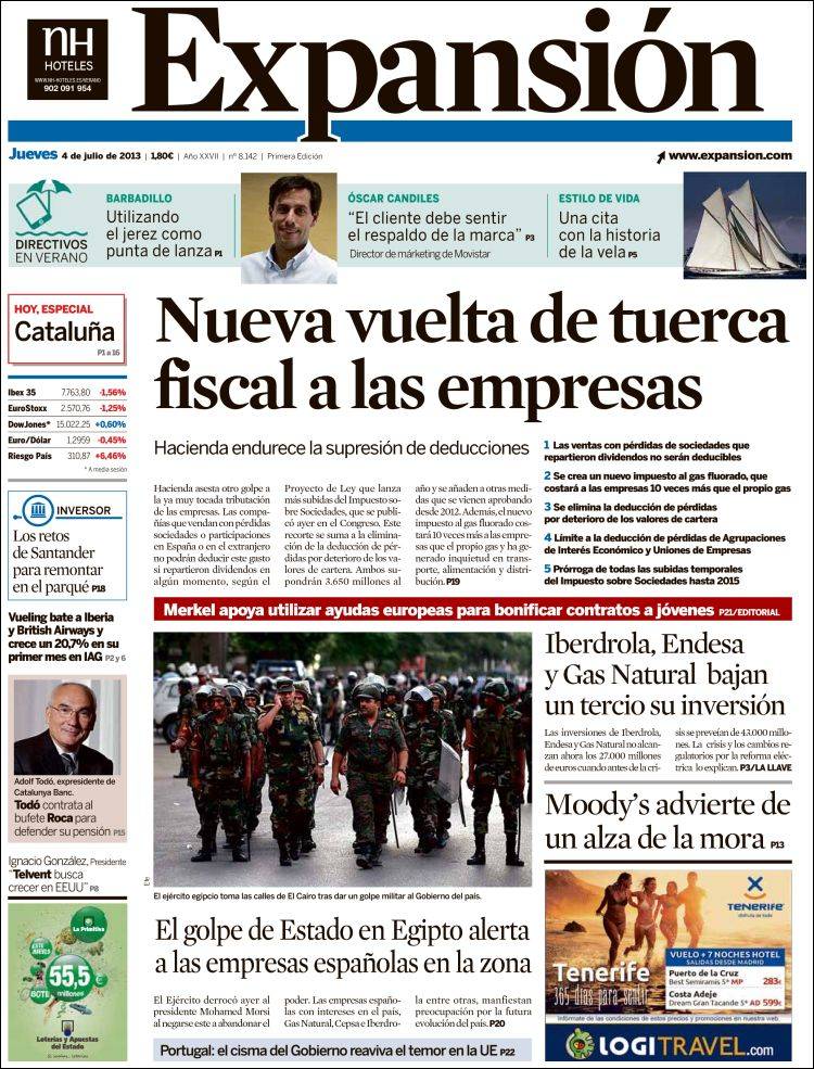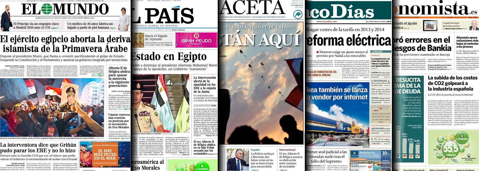 Portadas de los diarios El Mundo, El País, ABC, La Razón, La Gaceta, La Vanguardia, El Periódico, Expansión, el Economista, Cinco Días, Marca, As, Mundo Deportivo y Sport.
