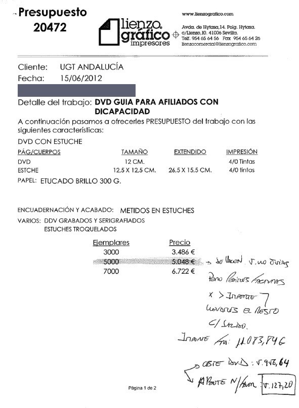 Pero en unas expresivas anotaciones a mano, se dice: "Se hacen 5.000 DVD´s, pero pedimos facturas por mayor importe y llevaros el resto con cargo a saldo. A continuación, se concreta cuál debe ser el importe final de la factura: 11.083,84 euros, que de desdoble en coste (5.956,64) y un BOTE a favor de UGT por importe de 5.127, 20 euros. Pero en el proceso el precio inicial de 1,009 euros por DVD ha pasado a ser de más de 2 euros la unidad, concretamente 2,21 euros/unidad. Esto se ha inflado el precio del producto más que duplicándolo.