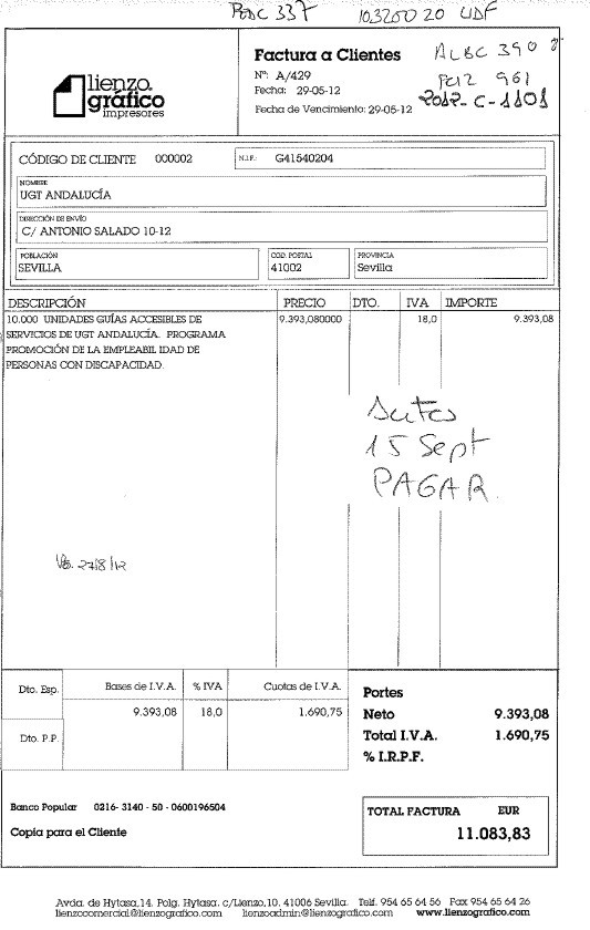 Efectivamente, la empresa Lienzo Gráfico Impresores no tiene más remedio que confeccionar la siguiente factura que se ajusta como un guante a la instrucción de UGT Andalucía: