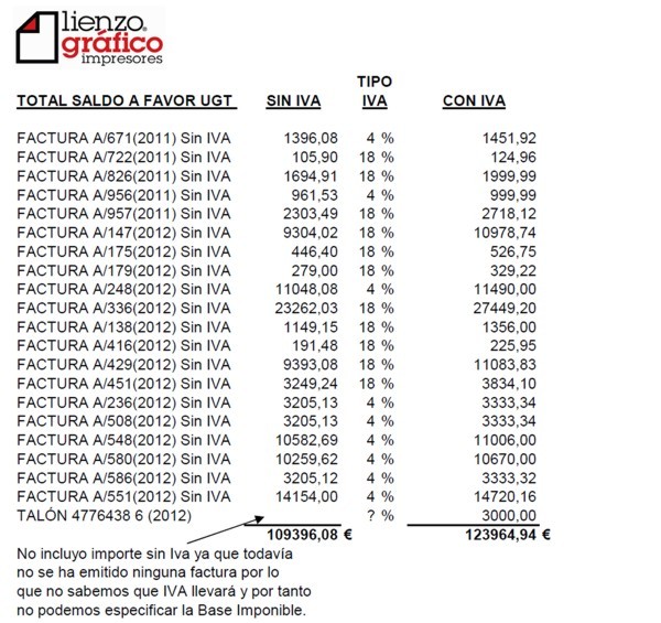 Aunque puede parecer una cantidad pequeña, se trata de una sola empresa y de uan sola factura. Pero si consideramos un grupo importante de facturas de esta misma empresa, Lienzo Gráfica Impresores, el procedimiento del SALDO o BOTE desarrollado por UGT para originar una bolsa de dinero a partir de facturas falseadas es realmente importante.