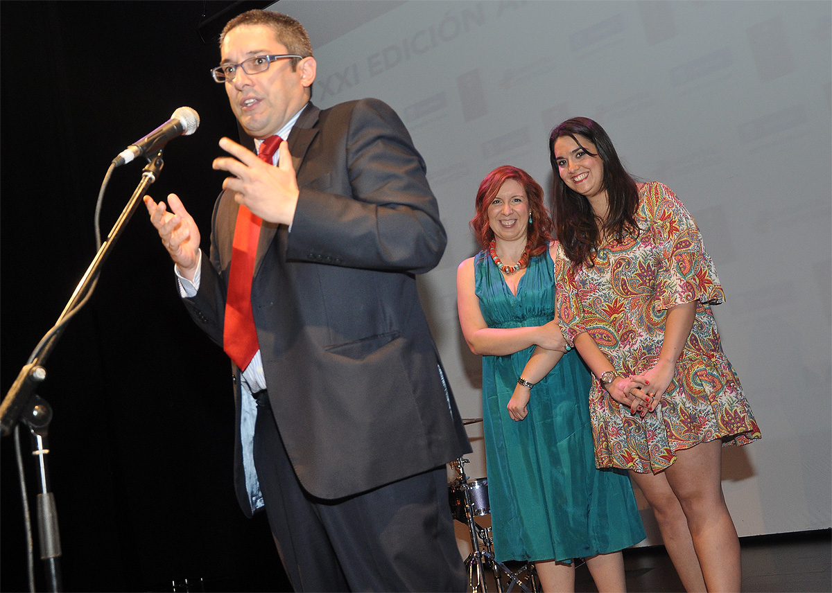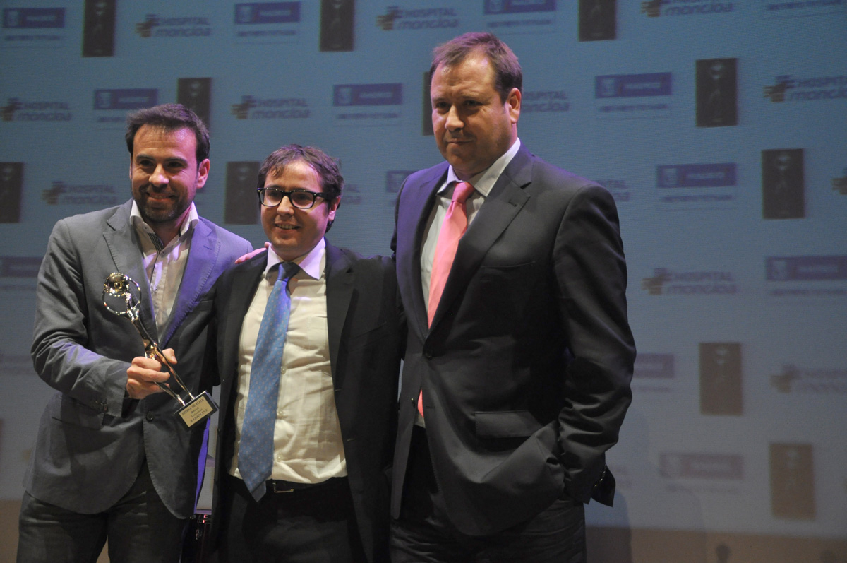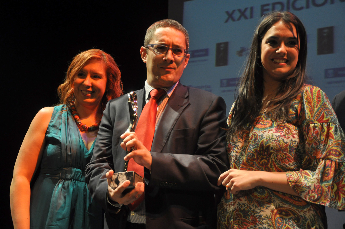 Mario Noya y su equipo, Carmen Carbonell y Carmen Pulín, reciben el galardón de la mano del director de cine Antonio del Real.