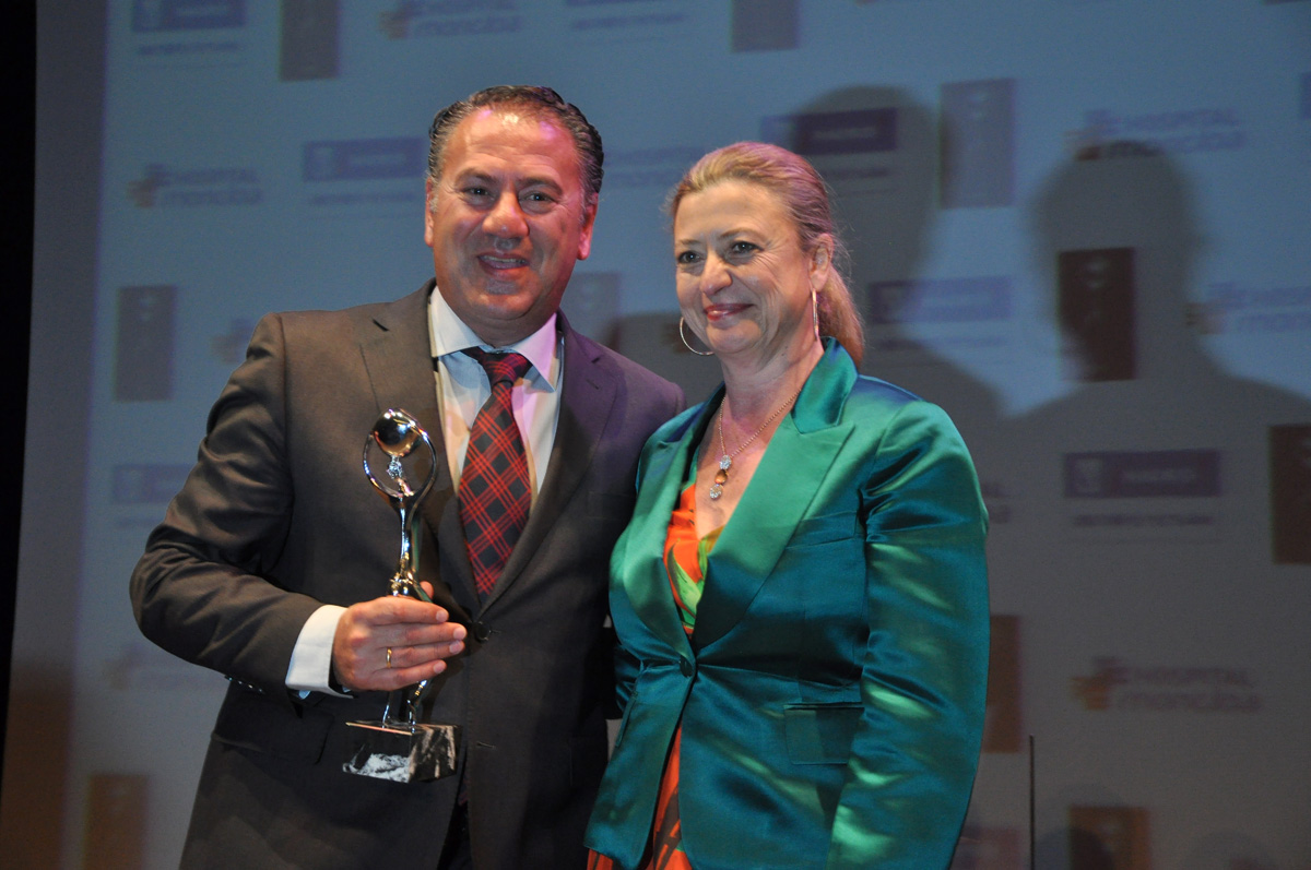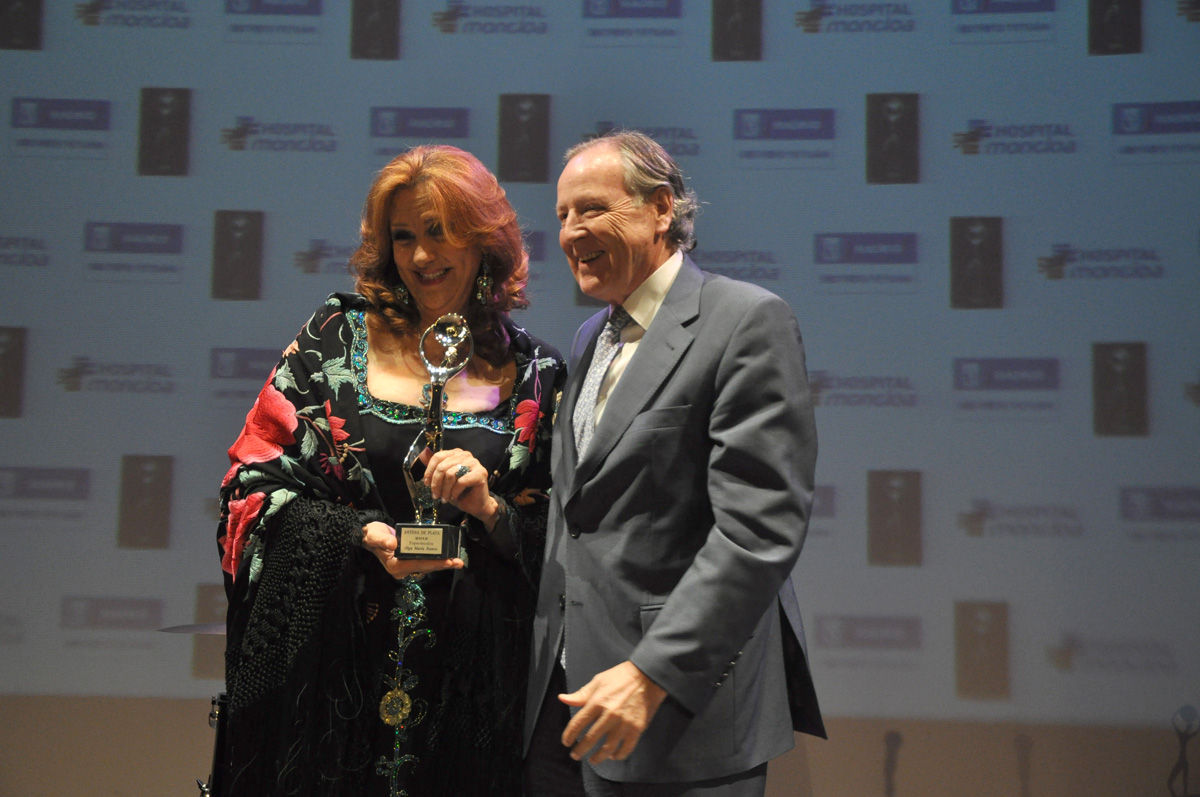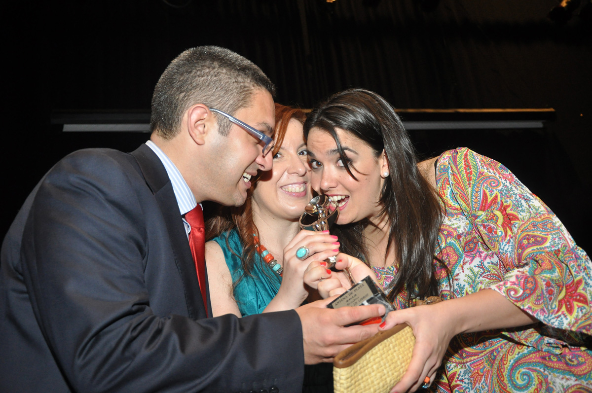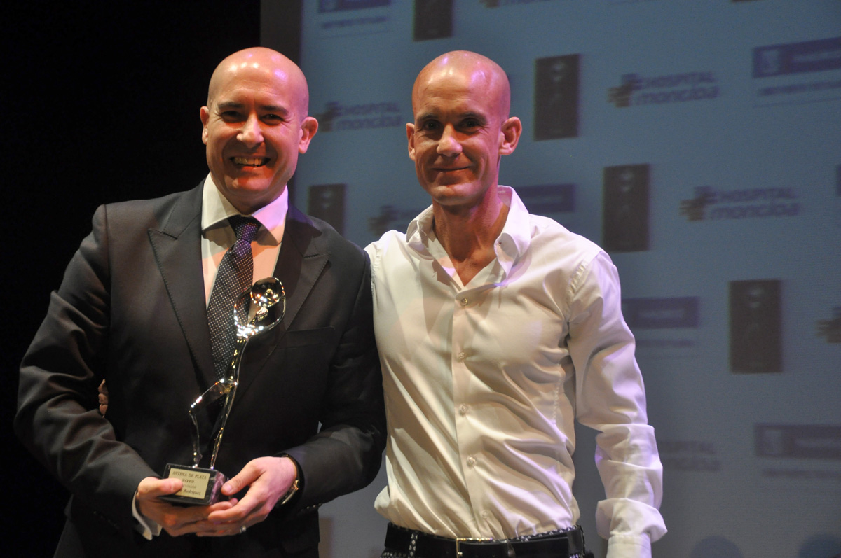 Mario Noya y su equipo, Carmen Carbonell y Carmen Pulín, reciben el galardón de la mano del director de cine Antonio del Real.