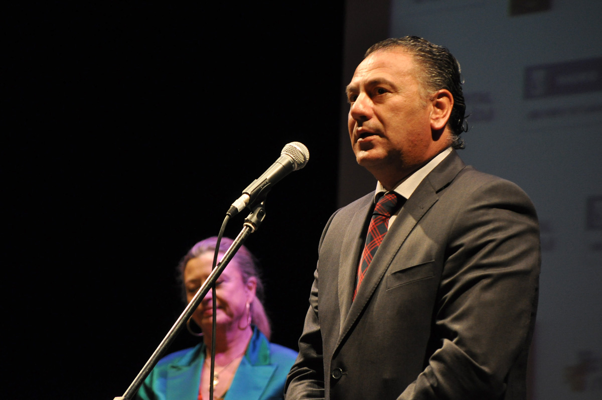 El director del programa de esRadio LD Libros, Mario Noya, dirigiéndose al público presente en la gala, después de recibir la Antena de Plata.