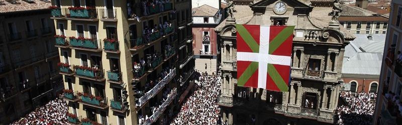 Instantes antes de las 12, varias personas han desplegado una enorme bandera del País Vasco en la plaza del Ayuntamiento de Pamplona, que ya esperaba abarrotada el lanzamiento del chupinazo.