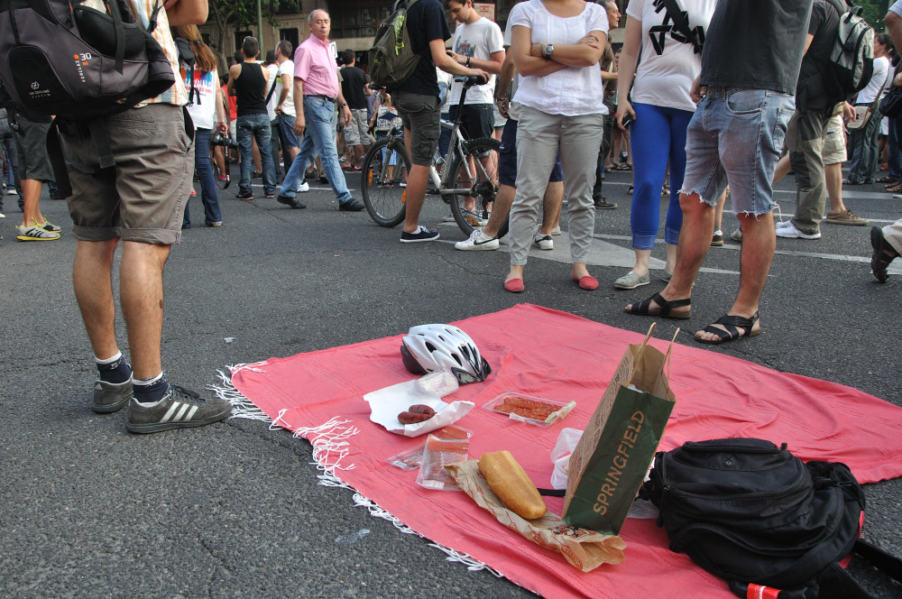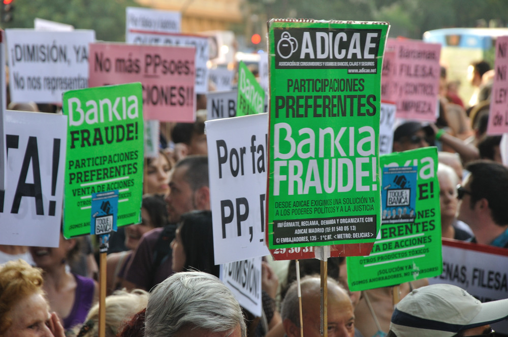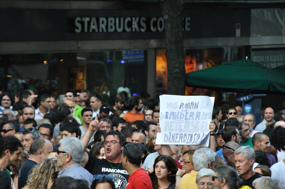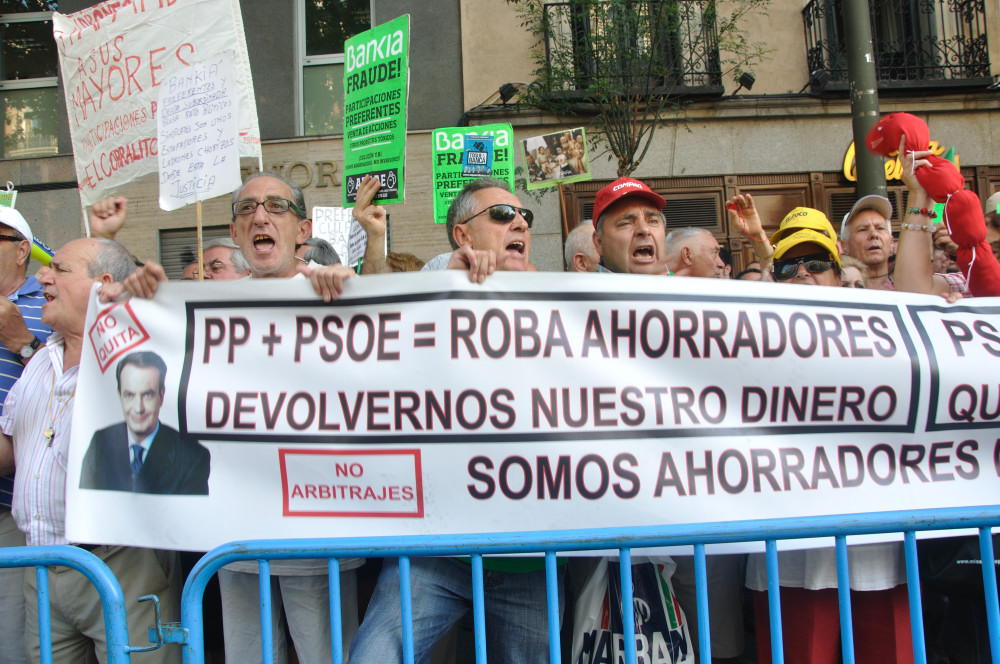 Muchos de los carteles que se pudieron ver en la llamada manifestación "Barbacoa de chorizos" hacían alusión a Bakia y a las preferentes.