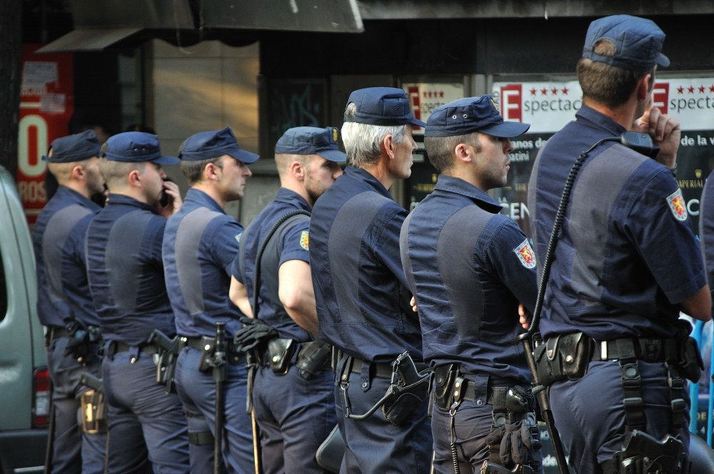 Dos policías nacionales vigilan de cerca los movimientos de los manifestantes allí presentes.