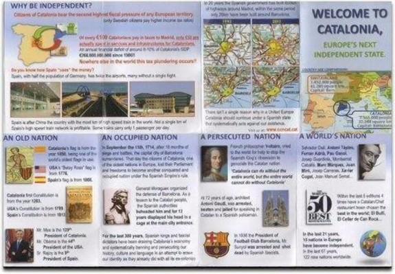 El folleto, repartido por un gran número de taxistas -incluidos extranjeros como paquistaníes-, comienza dando la bienvenida a los turistas a "Cataluña: el próximo nuevo estado independiente de Europa". El documento asegura que la región es una "nación perseguida" y "ocupada", exponen la teoría de lo que ellos llaman "expolio fiscal" y lo ejemplifican con dos mapas que comparan las carreteras que se han construido en Madrid y en los alrededores de Barcelona en los últimos años.