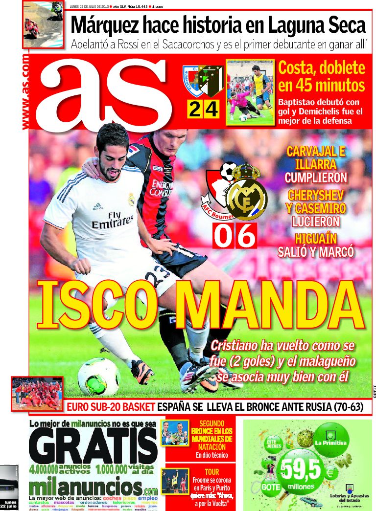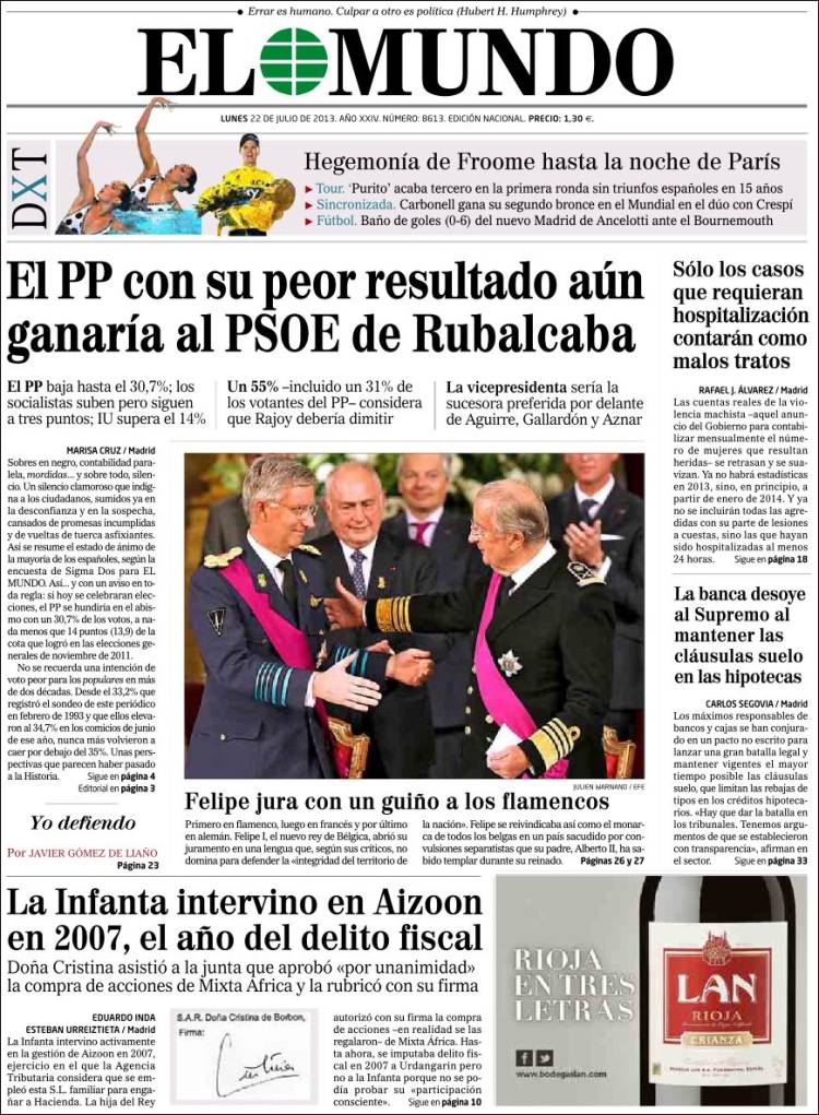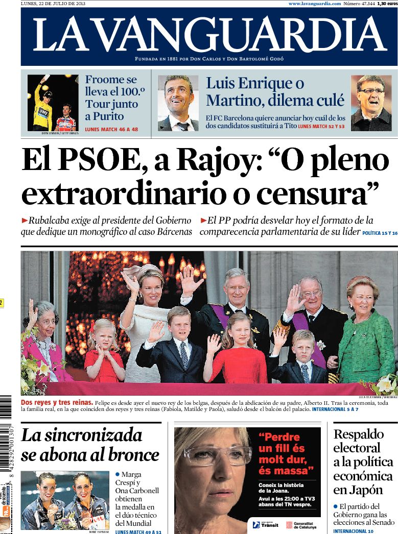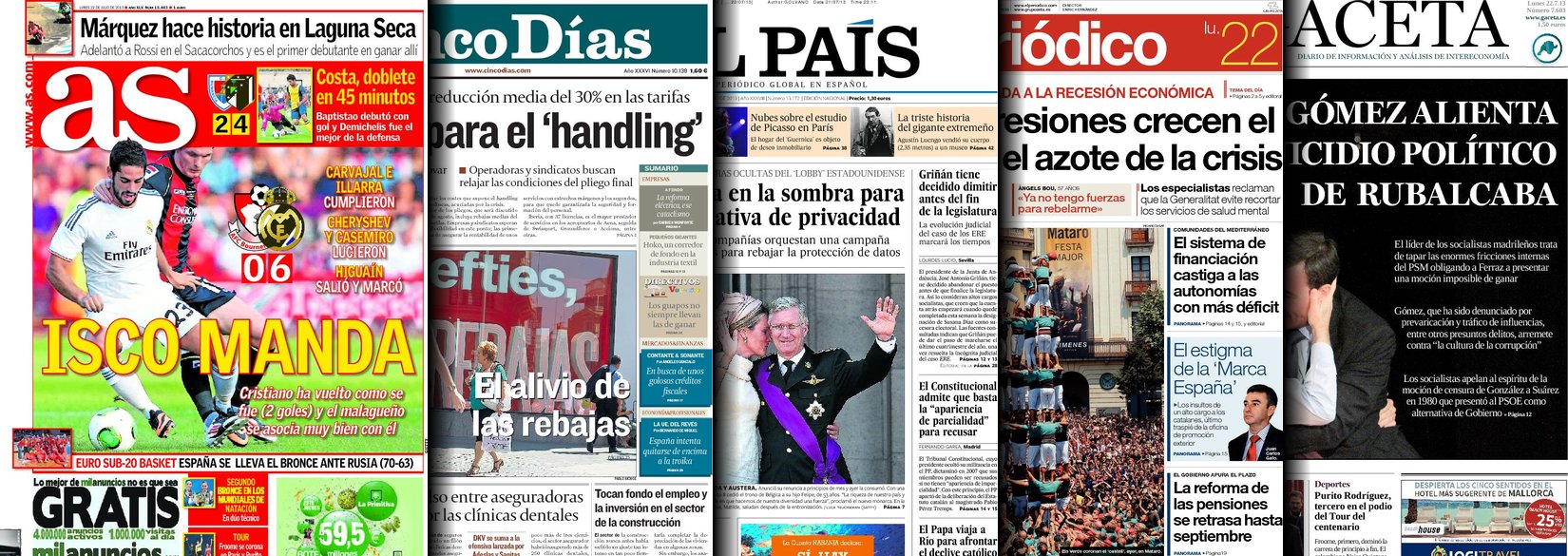 Portadas de los diarios El Mundo, El País, ABC, La Razón, La Vanguardia, La Gaceta, El Periódico, Cinco Días, El Economista, Expansión, Marca, As, Mundo Deportivo y Sport.