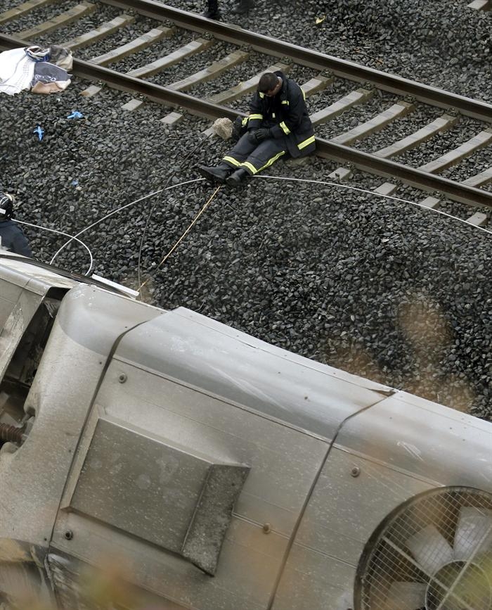 Un miembro del cuerpo de Bomberos, sentado junto a la vía durante las labores de rescate