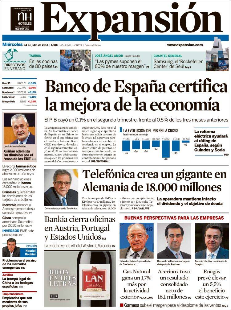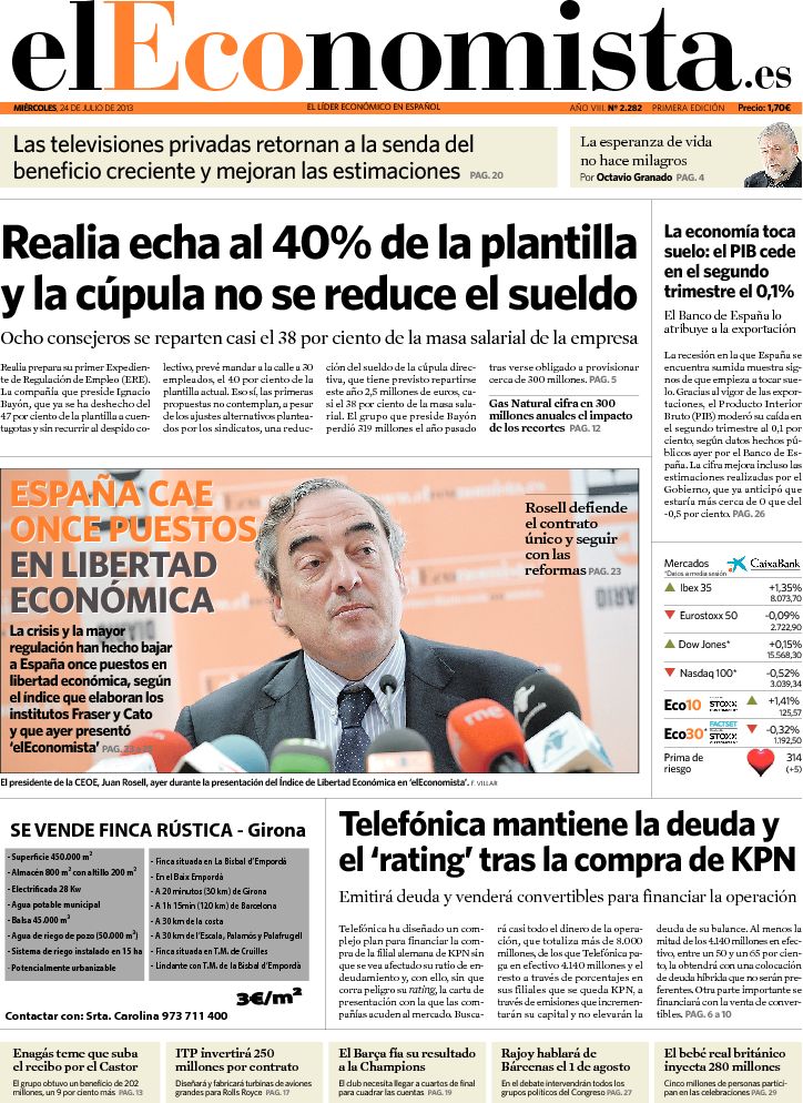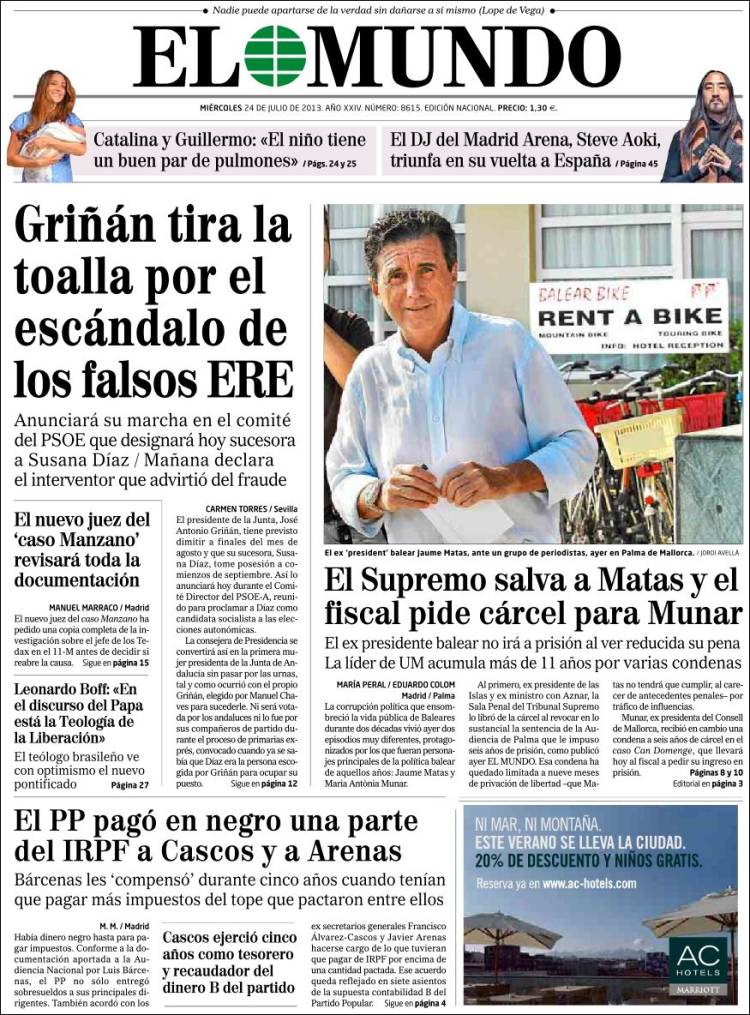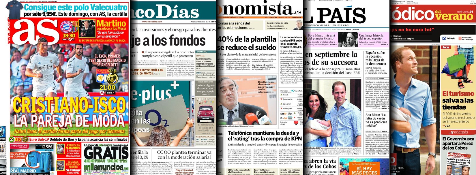 Portadas de los diarios El Mundo, El País, ABC, La Razón, La Vanguardia, La Gaceta, El Periódico, Cinco Días, El Economista, Expansión, Marca, As, Mundo Deportivo y Sport.