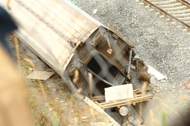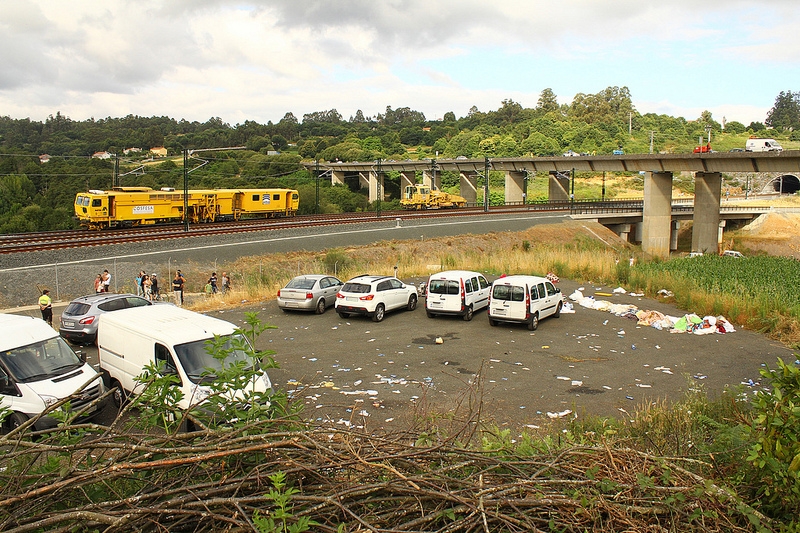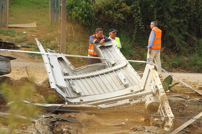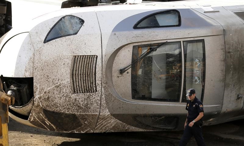 En esta imagen podemos ver un tren de mantenimiento al lado de los vagones del tren accidentado.