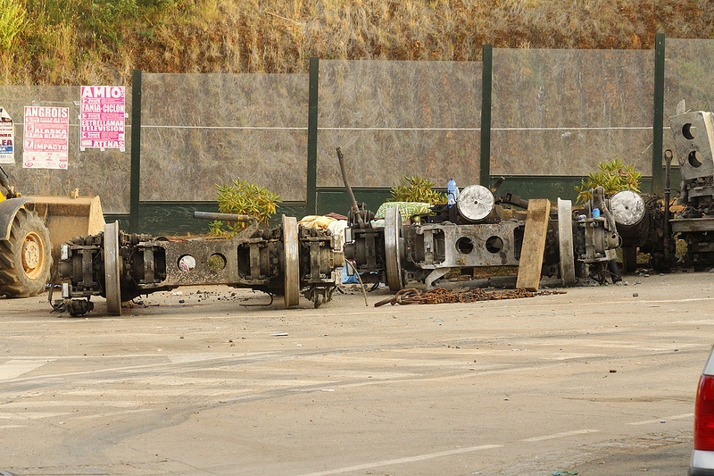 Uno de los vagones más destrozados es retirado por uno de los camiones.