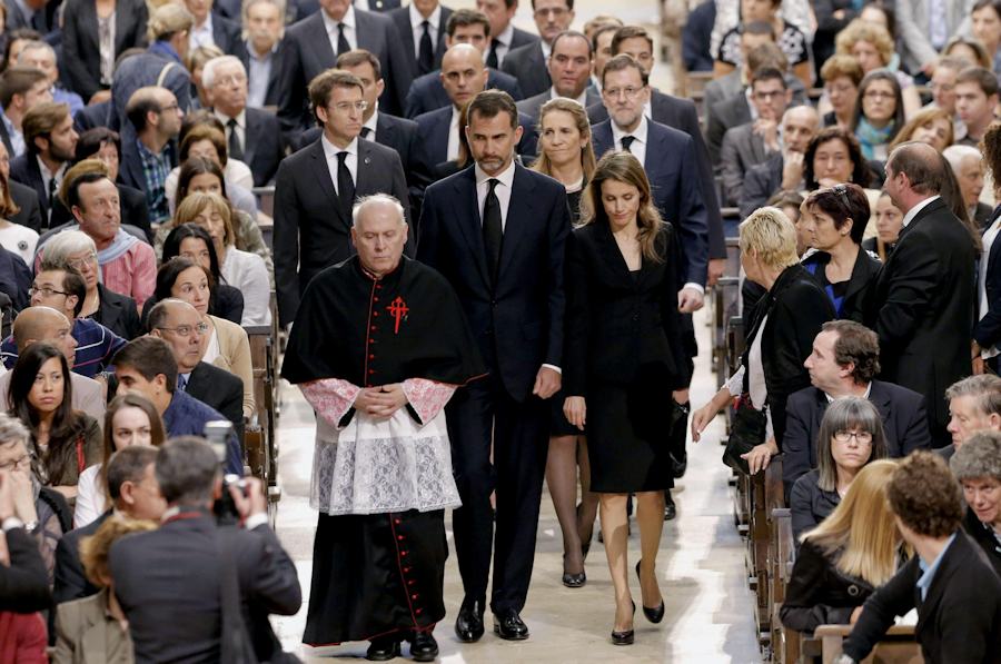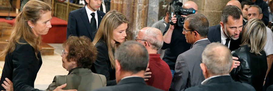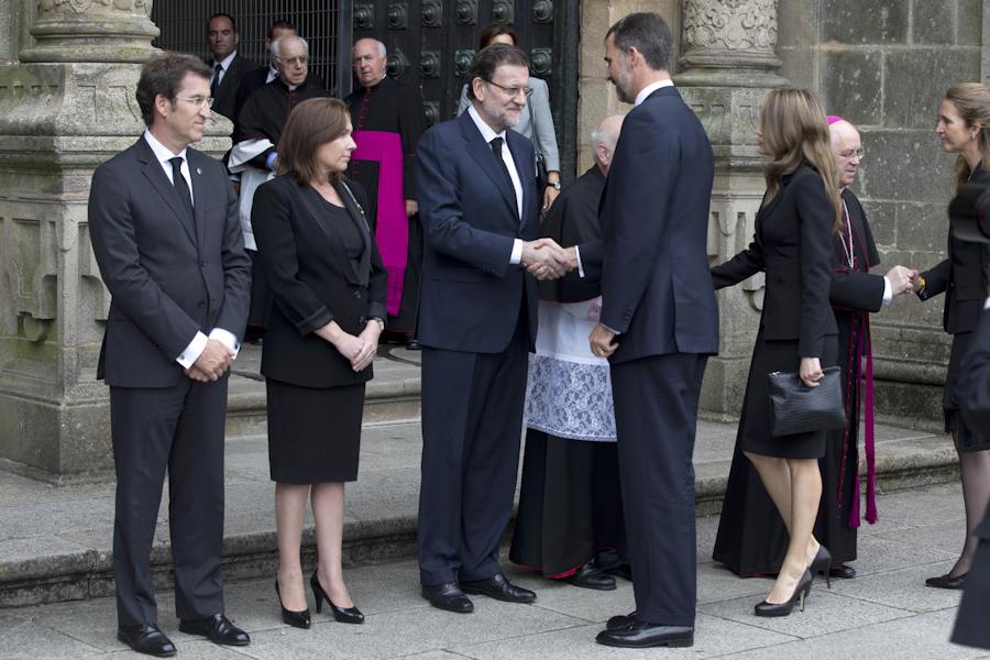 Tristeza contenida en la catedral de Santiago. Las máximas autoridades del Estado, encabezadas por los príncipes de Asturias, han asistido al funeral por las víctimas del accidente de Santiago.
