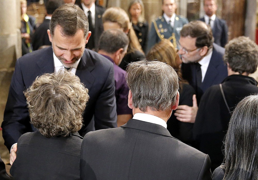 Don Felipe arropa a dos de los afectados. Detrás, Mariano Rajoy y su esposa saludan a los familiares de las víctimas
