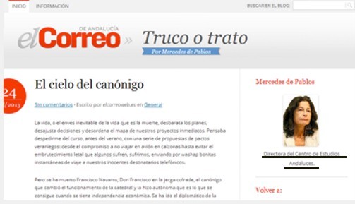 También está el caso, por señalar uno más, de la flamante directora del Centro de Estudios Andaluces, nombrada precisamente por Susana Díaz, la sucesora de Griñán, que en sus artículos en El Correo de Andalucía firme como Mercedes de Pablo, con su puesto explícito. Vean:
