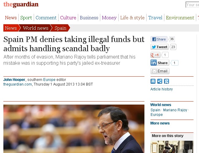 En Moncloa no ocultan que uno de los motivos que llevó a Rajoy a comparecer fue el duro editorial que le dedicó el Financial Times por el caso Bárcenas. Este jueves era precisamente ese diario el que a las pocas horas, destacaba que Rajoy había admitido errores y que el principal fue "confiar en el tesorero del partido". La BBC también le da importancia a la noticia y es la segunda de Europa. Al igual que el diario salmón, la televisión británica destacan las disculpas de Rajoy, aunque luego recuerda cuando aseguró que la mayor parte del escándalo "eran mentiras y manipulaciones". Sin movernos de país, The Guardian lleva en su portada digital que "Rajoy ha negado haber recibido fondos ilegales pero ha admitido que el escándalo fue mal manejado". También destaca que el presidente del Gobierno ha dado explicaciones después de meses de evasión.