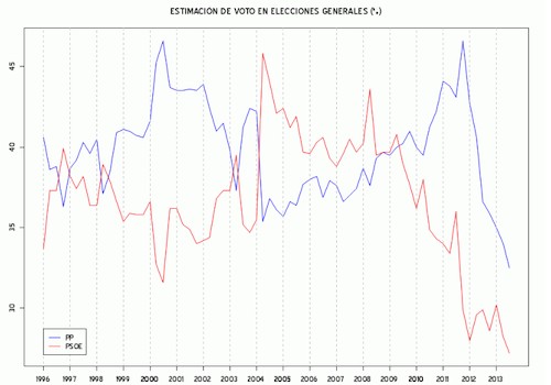 La encuesta del Centro de Investigaciones Sociológicas (CIS) del pasado mes de julio refleja la caída de los dos partidos mayoritarios, el PP y el PSOE, que marcan sus peores registros de los últimos años (32,5 y 27,2% respectivamente), mientras siguen en ascenso tanto Izquierda Unida como UPyD.