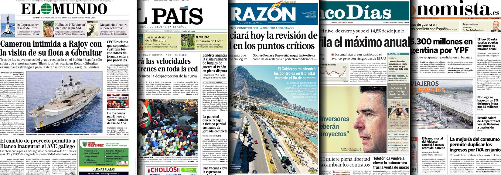 Portadas de los diarios El País, La Gaceta, La Razón, As, Cinco Días, El Periódico, El Economista y La Vanguardia.
