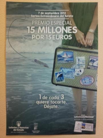 En los carteles de la polémica campaña se anunciaba el sorteo extraordinario del 7 de septiembre, el Sorteo del Turista, en el que hay un premio especial de 15 millones de euros por 15 euros que cuesta el boleto, con el lema '1 de cada 3 quiere tocarte. Déjate'. Junto a este lema en el cartel se ve la imagen de una mujer sujetando una maleta.