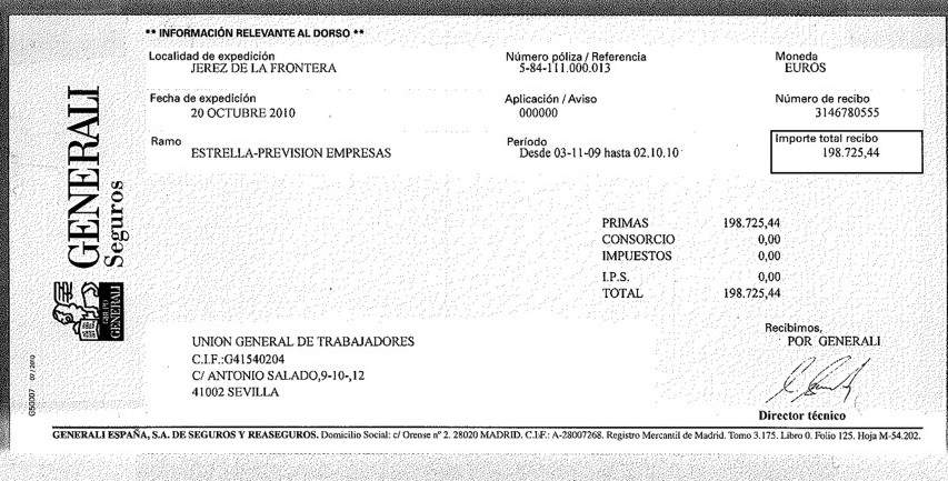 Lo asombroso es que UGT-A, en previsión de todos estos despidos, contrató con Generali, una sólida compañía de seguros cuyo nombre se ha tenido que asociar al caso de los ERE, un seguro colectivo con el número 5-84-111-000-013. El documento que lo prueba es el siguiente: