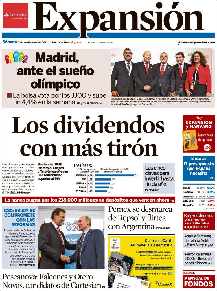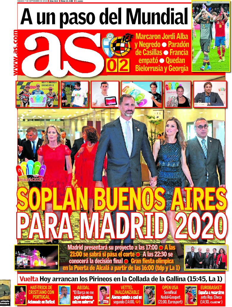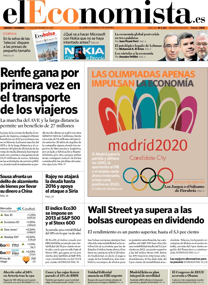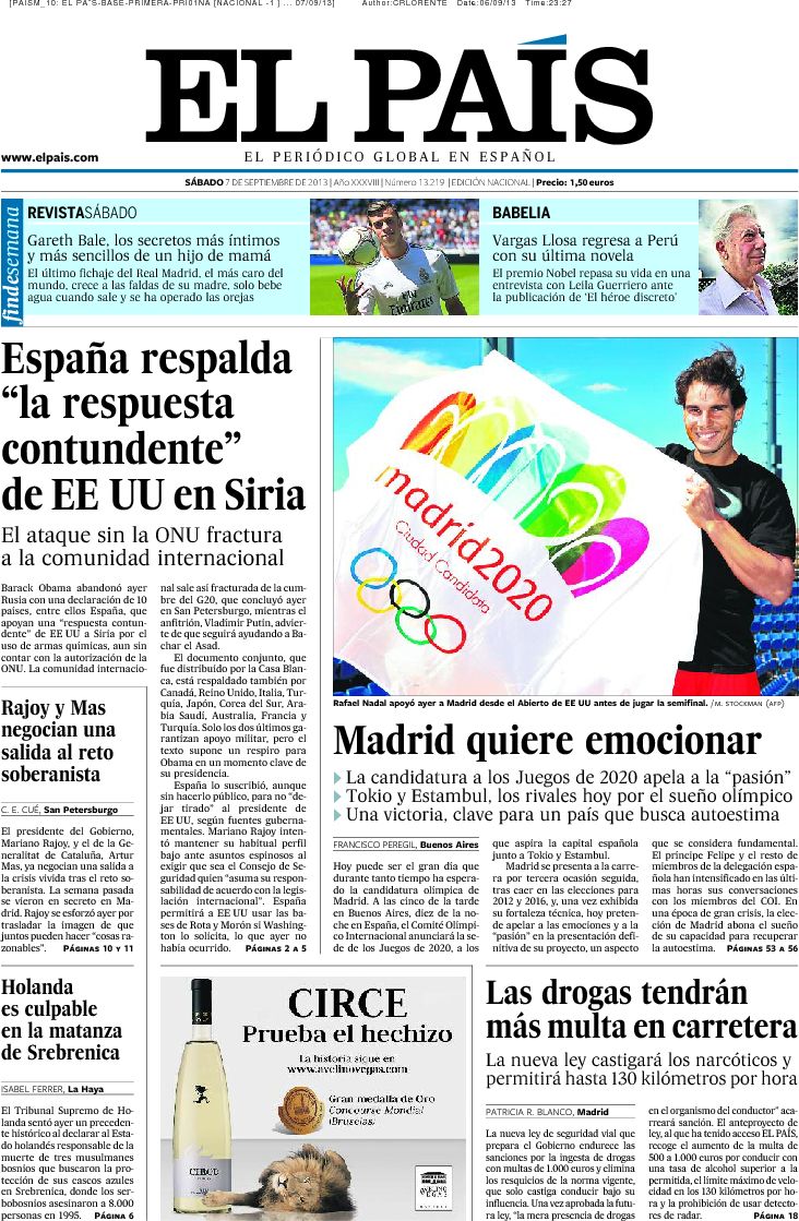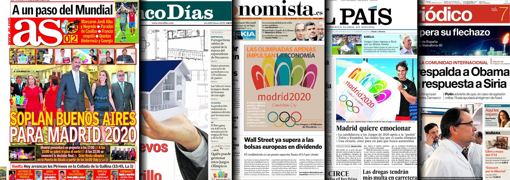 Portadas de los diarios El País, La Gaceta, La Razón, As, Cinco Días, El Periódico, El Economista y La Vanguardia.
