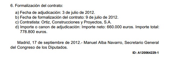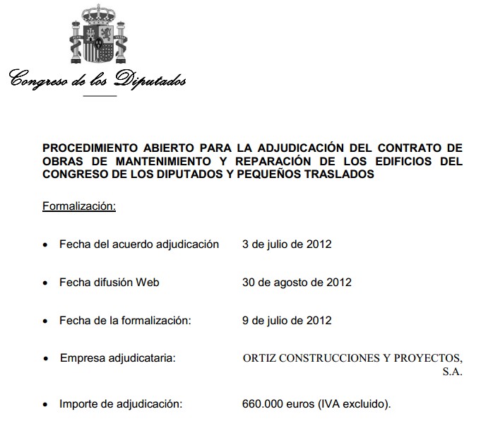 Un pequeño rastreo por la web del Congreso y por el BOE confirma que la empresa adjudicataria del contrato de "Obras de mantenimiento y reparación de los edificios del Congreso de los Diputados" es el Grupo Ortiz, Construcciones y Proyectos SA, que preside Juan Antonio Carpintero Ortiz.