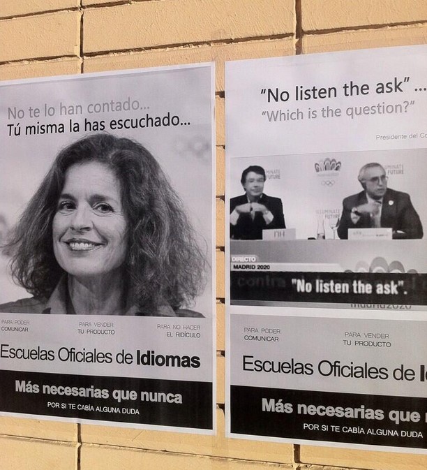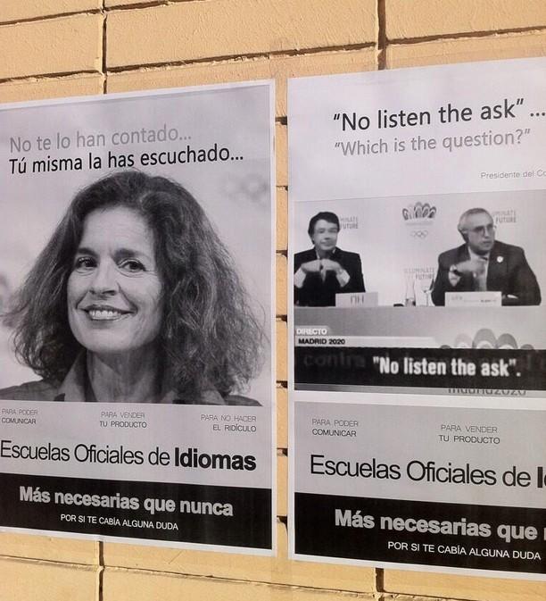 La imagen de la alcaldesa de Madrid, Ana Botella, el presidente de la comunidad autónoma, Ignacio González, y el presidente del Comité Olímpico Español, Alejandro Blanco, ha sido utilizada en tres carteles reivindicativos para defender la necesidad de las Escuelas Oficiales de Idiomas.