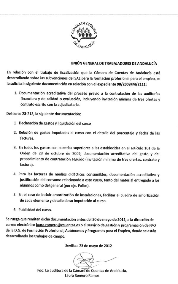 La Junta de Andalucía trasladó la petición de la Cámara mediante un escrito de la jefa del Servicio mencionado, María Magdalena Carril Iglesias y dirigido a UGT Andalucía en que se adjuntaba la nota de la Cámara de Cuentas y que está en poder de este periódico digital.