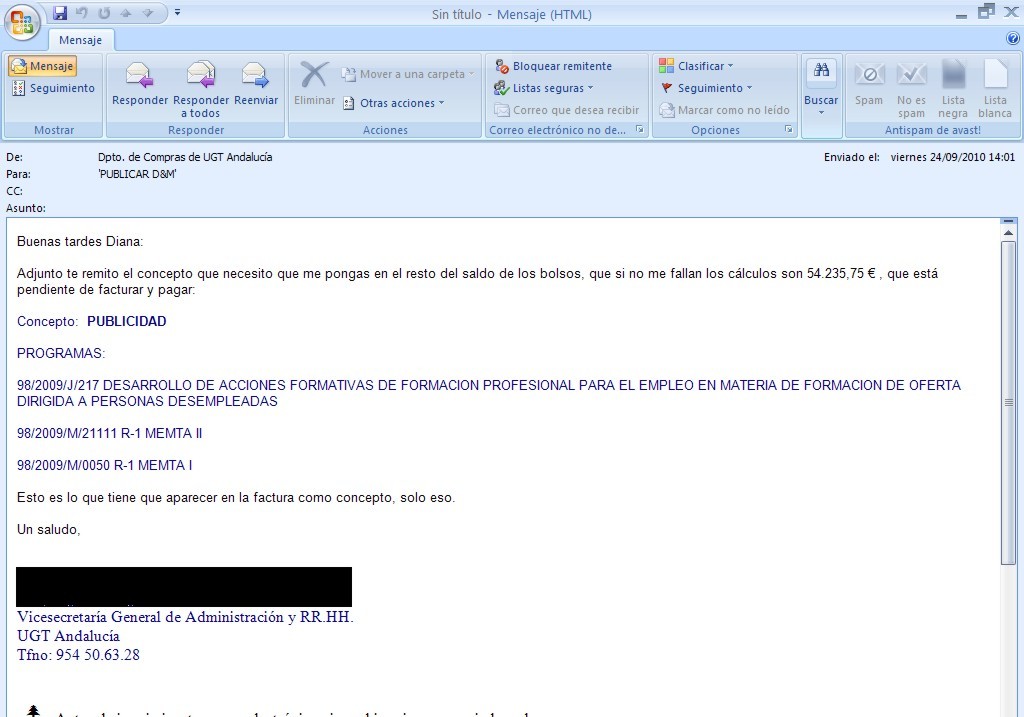 Naturalmente, UGT de Andalucía, vía secretaría de Organización, tuvo que ordenar falsear el pedido y las facturas dando como resultado que las bandoleras de propaganda se cargaron a las subvenciones del programa Orienta, como puede verse en una de las facturas y lo que es aún más llamativo, al desarrollo de acciones formativas de formación profesional para el empleo en materia de formación de oferta dirigida a personas desempleadas 98/2009/M/21111 R-1 MEMTA 11 98/2009/M/0050 R-1 MEMTA I (MEMTA se refiere al Plan de Medidas Extraordinarias para la Mejora de la Empleabilidad de las Personas Demandantes de Empleo, esto, de los parados registrados.)