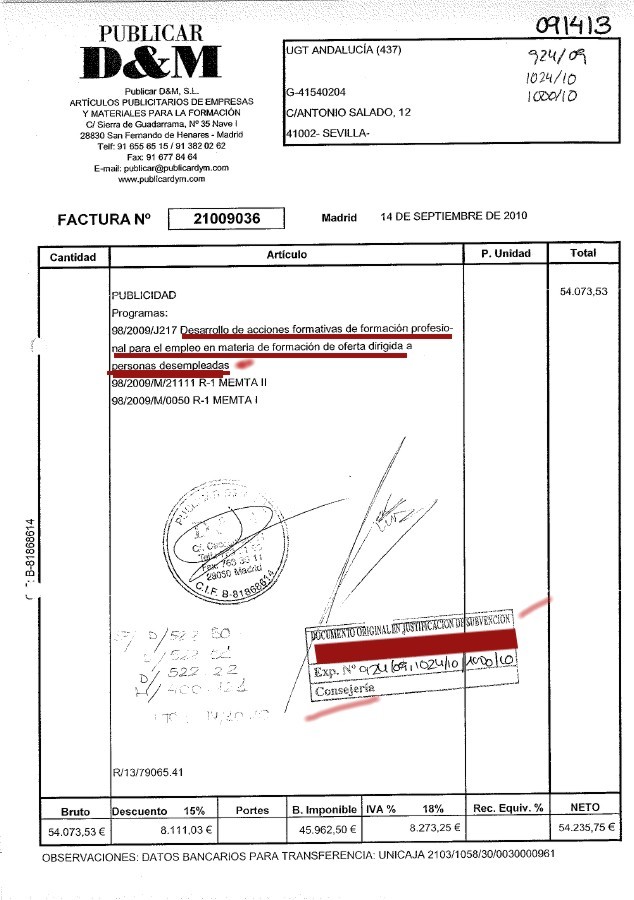 Una de las facturas que UGT de Andalucía incluía en su informe a la Cámara se corresponde con la emitida por la sociedad Publicar D&M, SL. y que lleva el número 21009036. Pero como Libertad Digital ya demostró documentalmente, esa factura está falseada porque bajo el supuesto costo publicitario de anunciar el curso de formación indicado se escondía la facturación real de 42.800 bandolerasa destinadas a la propaganda sindical en el proceso de elecciones sindicales de 2010.