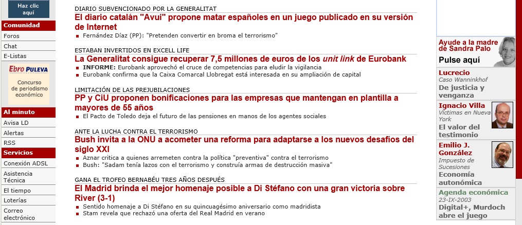 Tal día como hoy, 23 de septiembre, pero de 2003, Libertad Digital denunció en su portada que el diario Avui ofrecía en su edición digital un juego online llamado "La invasión de los Spainators", basado en la saga cinematográfica Terminator. En el mismo el jugador debía destruir robots, identificados como españoles, que pretendían invadir el "pacífico planeta Catalonian".