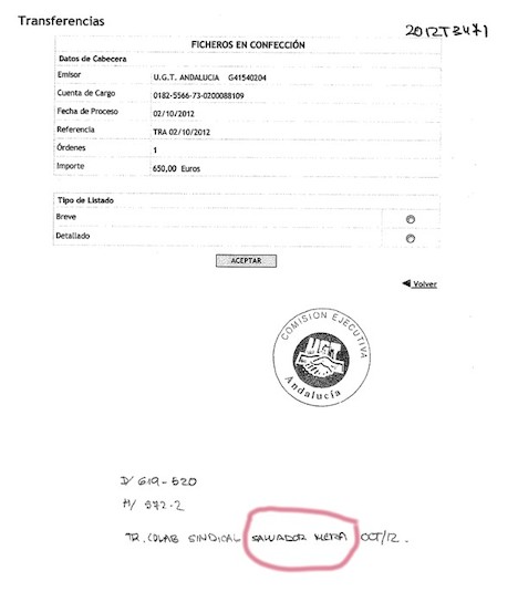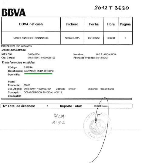 Al menos ese es el caso del secretario general de la UGT Cádiz, Salvador Mera, que cobraba 650 euros por gastos de actividad sindical. Estos son sus comprobantes de dos meses consecutivos de finales de 2012: