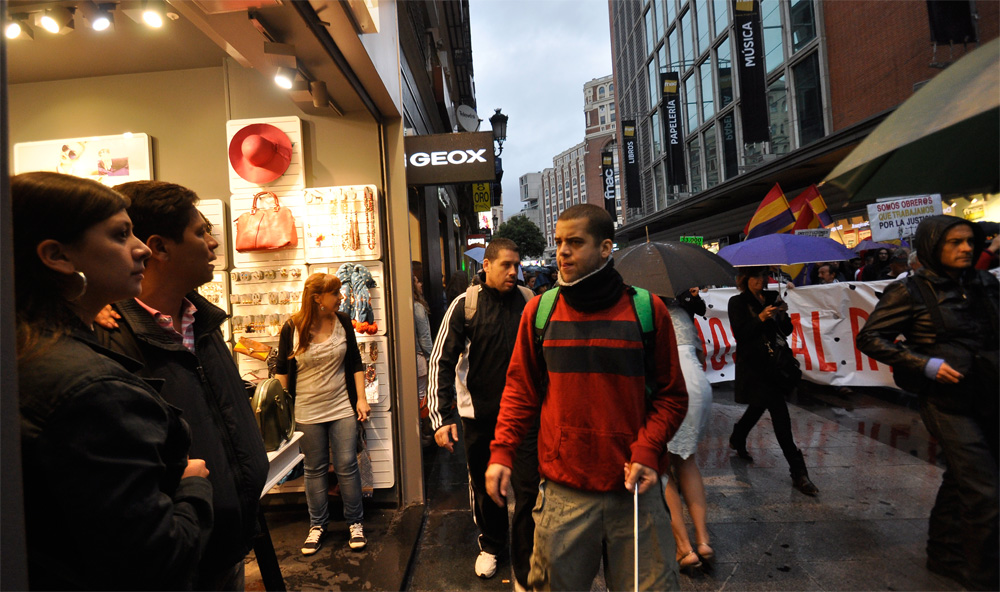 Uno de los líderes de la marcha daba indicaciones a la multitud para dirigirse a su destino atravesando por la zona comercial de Preciados.