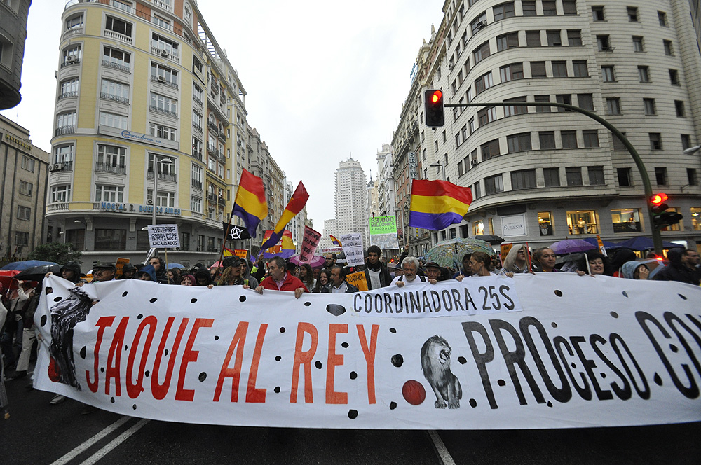 La marcha, que ha cortado varias calles principales del centro de Madrid este sábado, ha sido convocada por la Coordinadora 25-S para pedir la abolición de la monarquía y el inicio de un proceso constituyente.