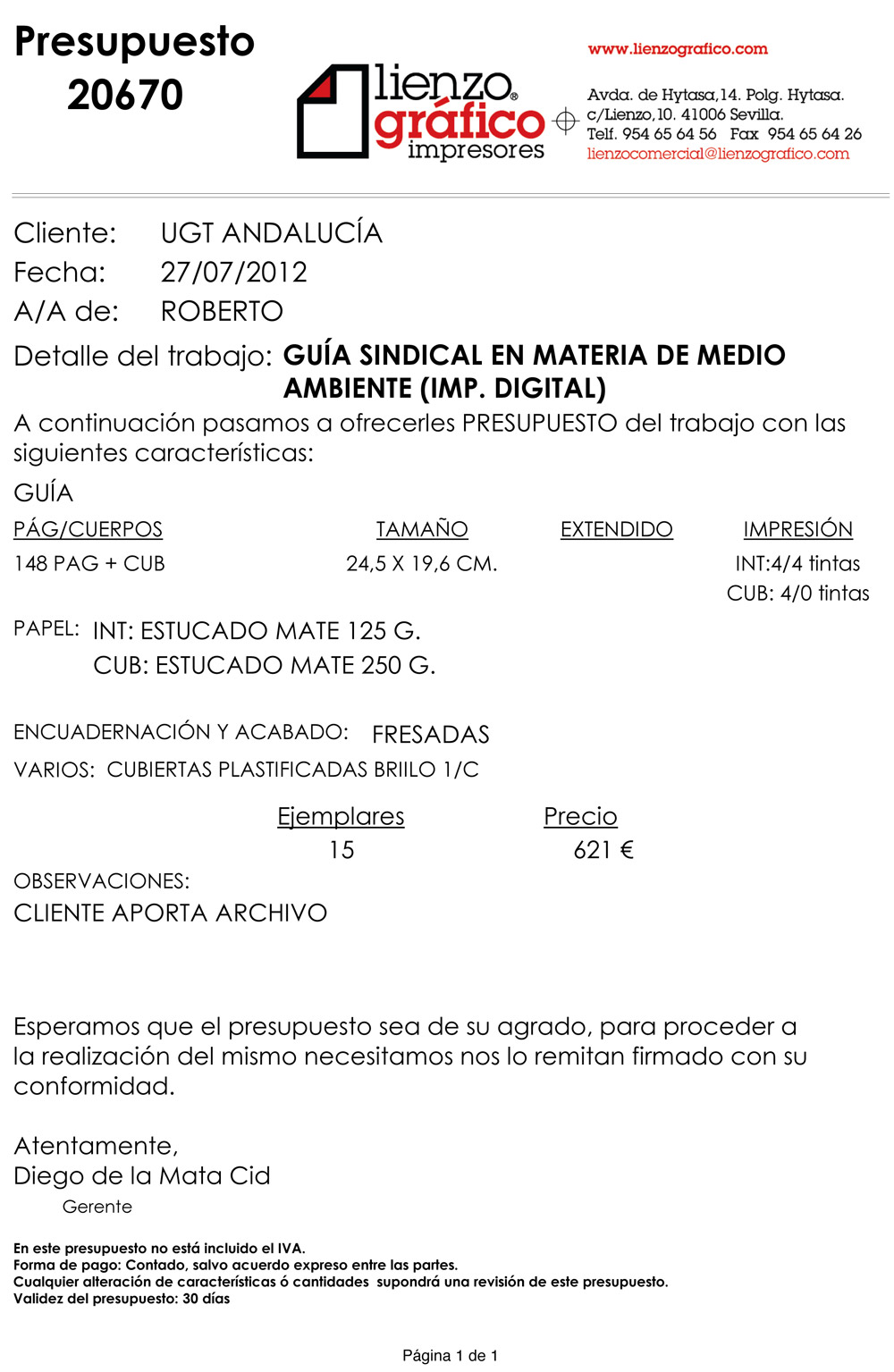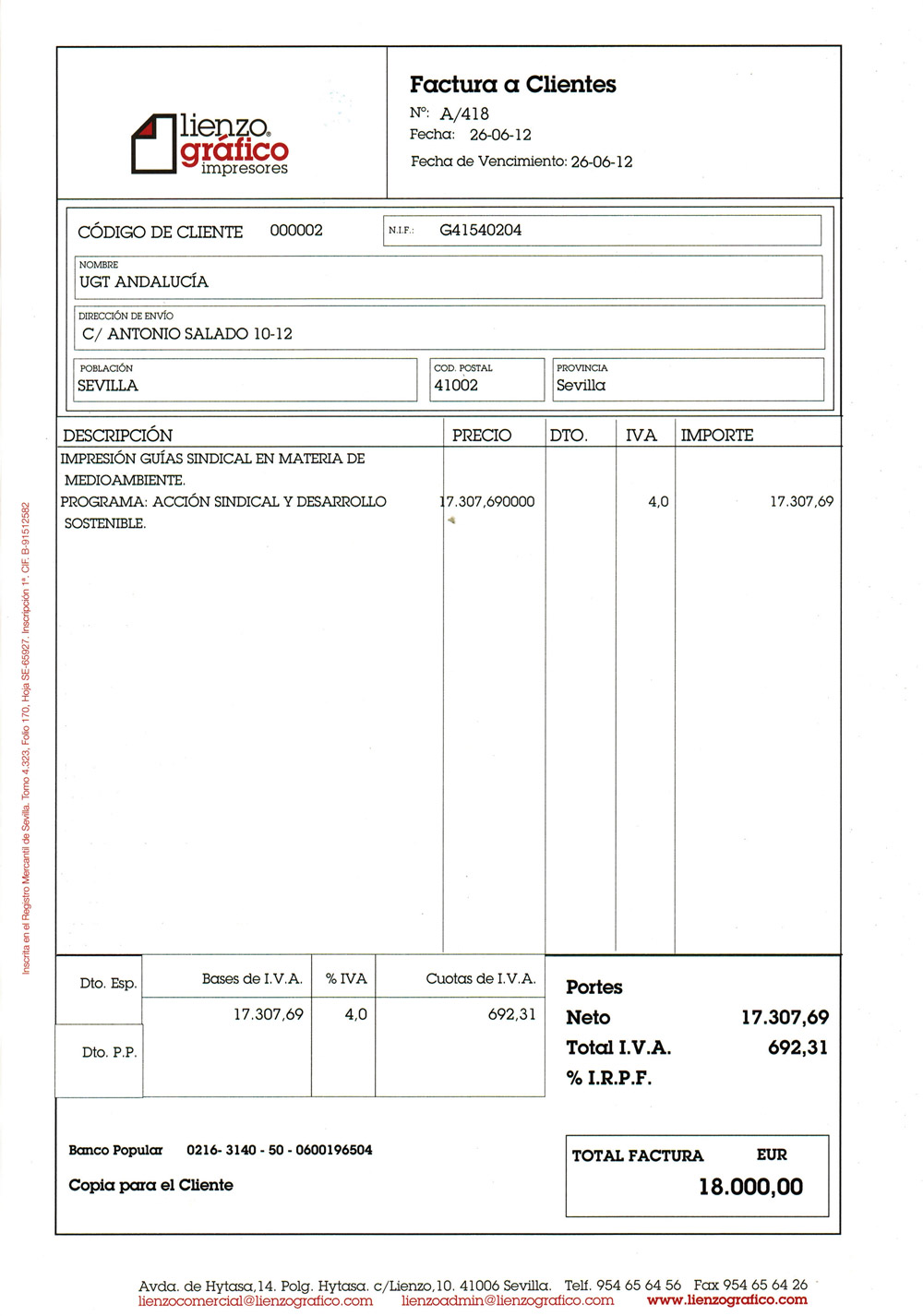 Tal y como te comenté por teléfono, necesitamos una factura por importe de 18.000 euros IVA incluido. Con el concepto siguiente: "Impresión Guías Sindical en materia de medioambiente". Programa: Acción sindical y desarrollo sostenible. La fecha debe ser anterior al día 30 de junio. Contra está factura vamos a llevar la población de 10 copias de la "Guía Sindical en materia de medioambiente". Para este trabajo ruego que contactes al compañero xxxxxxxxxxxxxxx de la Sª Acción Sindical. Un saludo,...."