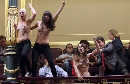 Espectáculo en el Congreso. Tres jóvenes se quitaron parte de parte de la ropa -en concreto, dejaron al descubierto sus pechos- cuando Alberto Ruiz Gallardón, ministro de Justicia, tomaba la palabra en la sesión de control y empezaron a gritar "aborto es sagrado".