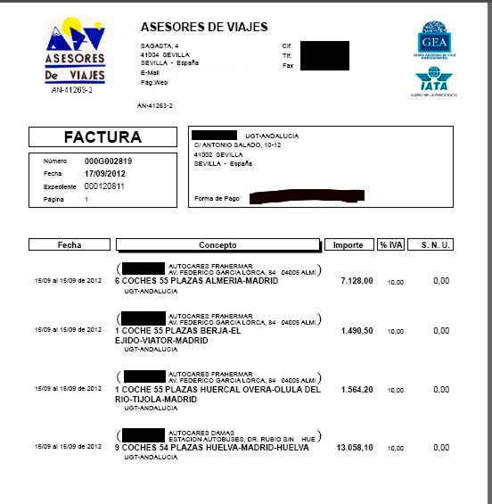 Por ejemplo, en la siguiente factura a nombre de UGT se reflejan los autobuses contratados por la UGT de Almería:
