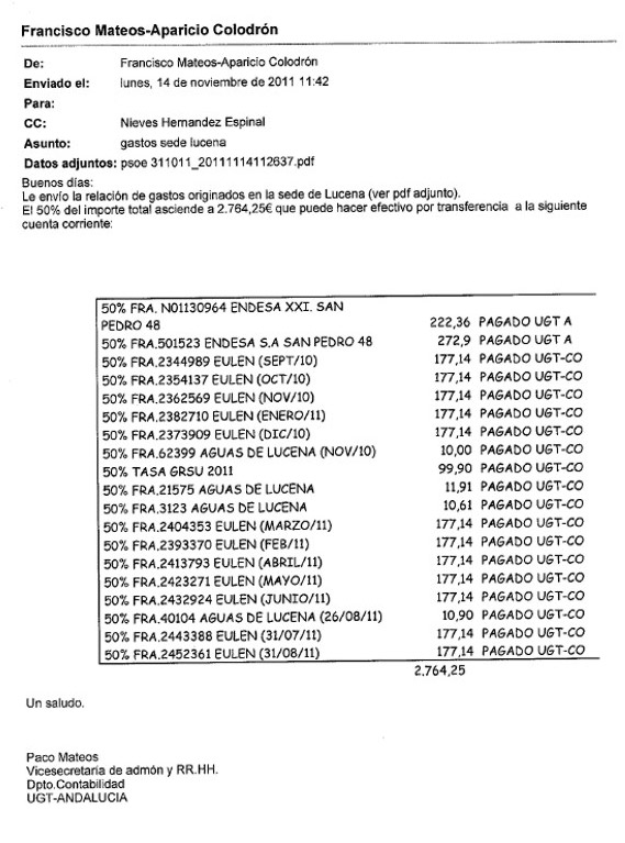 Hay un correo electrónico fechado el 14 de noviembre de 2011 que Francisco Mateos-Aparicio Colodrón, de la vicesecretaría de Administración y Recursos humanos de UGT Andalucía, concretamente del departamento de Contabilidad, remite a Francisco Morón, asesor socialista del Slcalde en el Ayuntamiento de Lucena desde 2007 y anteriormente comercial y agente de ventas de Merkamueble Europa,SA y de Muebles Peralta.