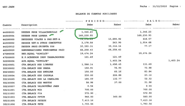En los balances por provincias de UGT Andalucía aparecen extrañas cantidades entregas al PSOE, que queda reflejado como deudor, a los que no se refiere concepto alguno. Por ejemplo, vean estas dos de Jaén, uno del PSOE de Villacarrillo y otro de Lopera que ascienden, nada menos, que a 160.230 euros, lo que es una cantidad supuestamente muy importante para una organización sindical.