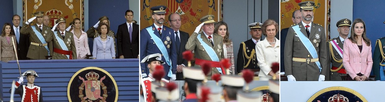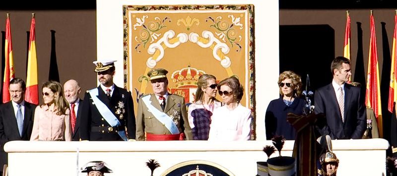 Ya situados de espaldas al sol, el 12 de octubre de 2011, Sus Majestades los Reyes estaban acompañados por los Príncipes de Asturias y las infantas Elena y Cristina. Iñaki Urdangarín también ocupó un lugar en la principal tarima del desfile del día de la Hipanidad.