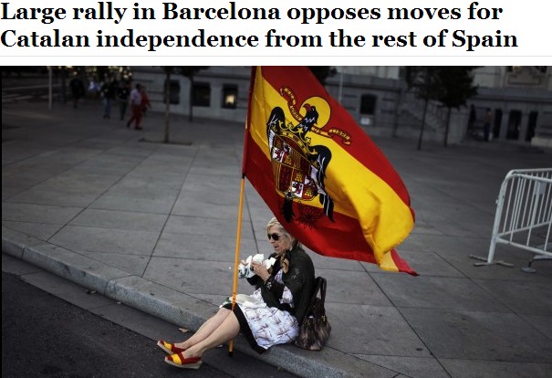 El diario estadounidense se hizo eco de las miles de personas que salieron a la calle el pasado sábado en Barcelona para reafirmar su derecho a ser también españoles. No obstante, seleccionó para ilustrar la información dos fotos: en una de ellas aparece una mujer sentada en la acera y portando una bandera con el águila de San Juan aunque la foto no se haya producido en Barcelona. En la segunda, se puede ver a uno de los legionarios, tatuado, que desfilaron también por la capital con motivo del Día de la Hispanidad.