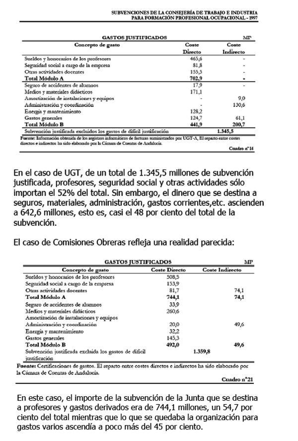 Desde 2004 a 2009, según la investigación de Libertad Digital en el Boletín Oficial de la Junta de Andalucía sin contar Fundaciones y otros organismos, UGT había recibido en calidad de subvenciones la cantidad de 122.433.196 euros. CC.OO había obtenido por el mismo concepto la cantidad de 143.049.447. La cifra es mayor del presupuesto anual de la ciudad de Cádiz para el año 2009 y casi el doble del presupuesto anual de la ciudad de Huelva. Aunque no todas estas subvenciones van destinadas a la formación, van a ese fin en su mayor parte.
