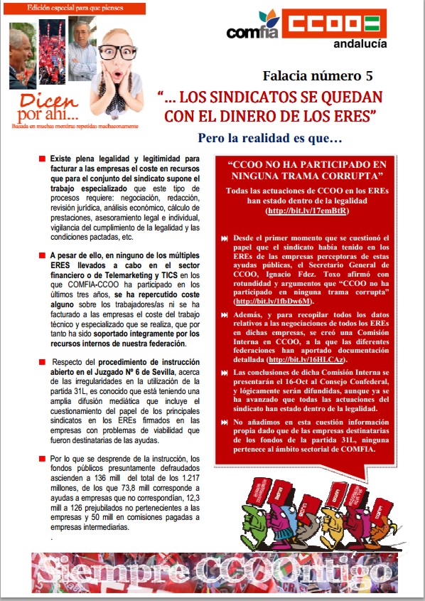 Concretamente en la pieza dedicada a los ERE, la número 5, se justifica que los sindicatos cobren por su participación en los ERE y otros conceptos que supongan actividades intermediadoras entre los trabajadores y las empresas: "existe plena legalidad y legitimidad para facturar a las empresas el coste en recursos que para el conjunto del sindicato supone el trabajo especializado que este tipo de procesos requiere: negociación, redacción, revisión jurídica, análisis económico, cálculo de prestaciones, asesoramiento legal e individual, vigilancia del cumplimiento de la legalidad y las condiciones pactadas, etc."